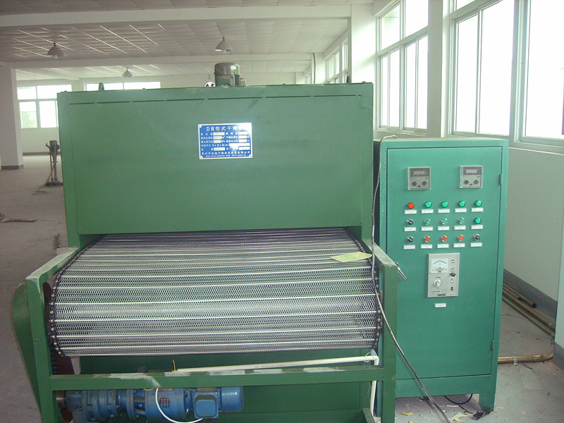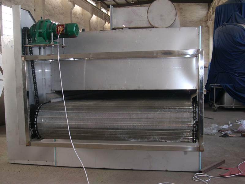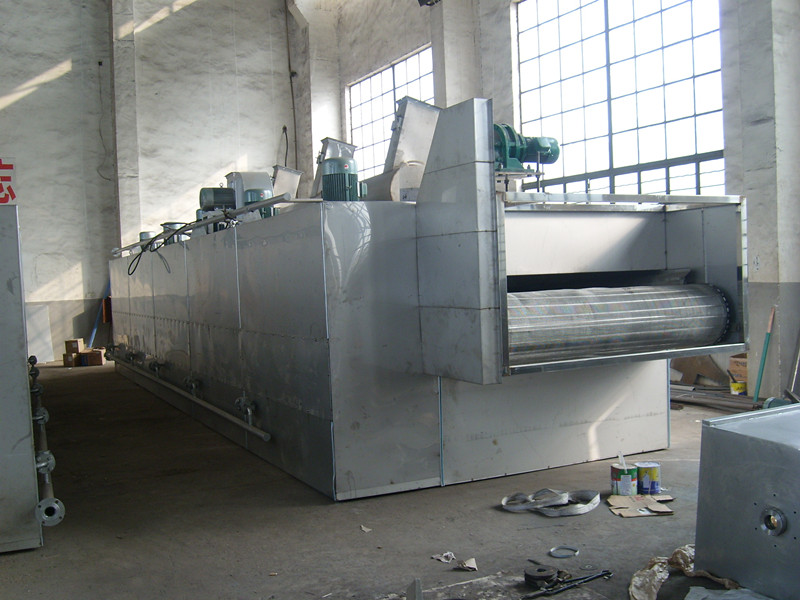 物料由加料器均勻地鋪在網帶上,網帶一般采用12-60目不銹鋼絲網,由傳動裝置拖動在干燥機內移動。干燥機由若干單元組成,每一單元熱風獨立循環,部分尾氣由專門排濕風機排出,廢氣由調節閥控制,熱氣由下往上或由上往下穿過鋪滿物料的網帶完成熱量與質量傳遞的進程,帶走物料水份。網帶緩慢移動,運行速度可根據物料溫度自由調節,干燥后的成品連續落入收料器中。上下循環單元根據用戶需要可靈活配備,單元數量亦可根據需要選取。