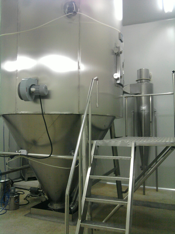 該機采用全封閉形式,所有部件均采用不銹鋼制造,配有三級凈化裝置,過濾后的空氣達十萬級要求。筒體與頂部裝有冷壁裝置,使壁溫<80℃,干燥塔內裝有氣刷掃塔裝置。經該機干燥后的中藥浸膏粉,不會出現焦化變質現象,大大增加了收粉率(95%以上),而且不會產生混藥現象和粘壁現象。