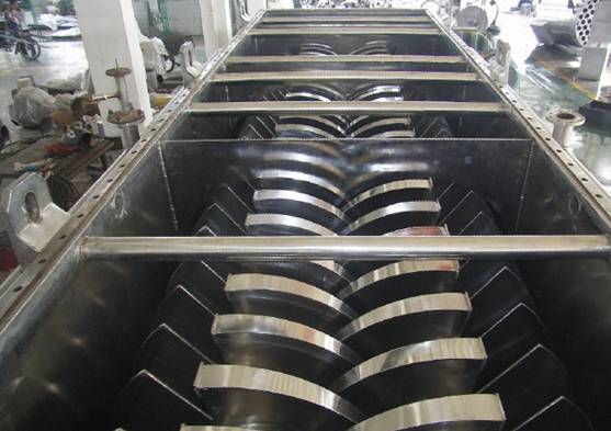 c.楔形槳葉具備自凈能力,可提大槳葉傳熱作用。旋轉槳葉的傾斜面和顆粒或粉末層的聯合運動所形成的分離力,使附著于加熱斜面上的污泥自動地清除,槳葉保持著大效的傳熱功能。另外,經于兩軸槳葉反向旋轉,交替地分段壓縮(在兩軸槳葉面相距最近時)和膨脹(在兩軸槳葉面相距離最遠時)攪拌功能,傳熱均勻,提大了傳熱效果。